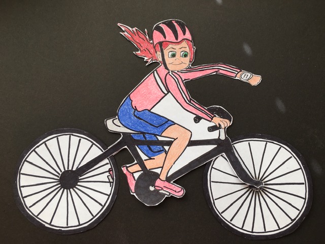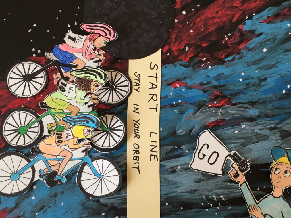 If we could see not only position but also time, the bikers would start and finish together. The only difference is the further the biker is from the gravity center the more the biker ages. Somewhat like a person that lives on the bottom floor of a high-rise closer to the gravity pull of the earth ages slower than a person on the top floor but they remain in the same building. It is just hard to measure those nanoseconds.
